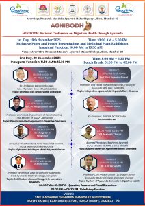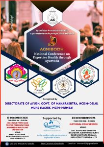 The “AGNIBODH: National Conference on Digestive Health through Ayurveda” was successfully organized over two days, on December 19th and 20th, 2025. The conference was hosted by the Ayurvidya Prasarak Mandal’s Ayurved Mahavidyalaya, Sion, Mumbai, an institution established in 1954. This renowned Ayurvedic teaching and research institution contributes significantly to Ayurvedic education, research, and healthcare, offering Undergraduate (BAMS), Postgraduate (MD/MS Ayurved), and Ph.D. programs. The institution also runs the Seth R. V. Ayurvedic Charitable Hospital, providing affordable healthcare, particularly benefiting economically weaker sections of society.